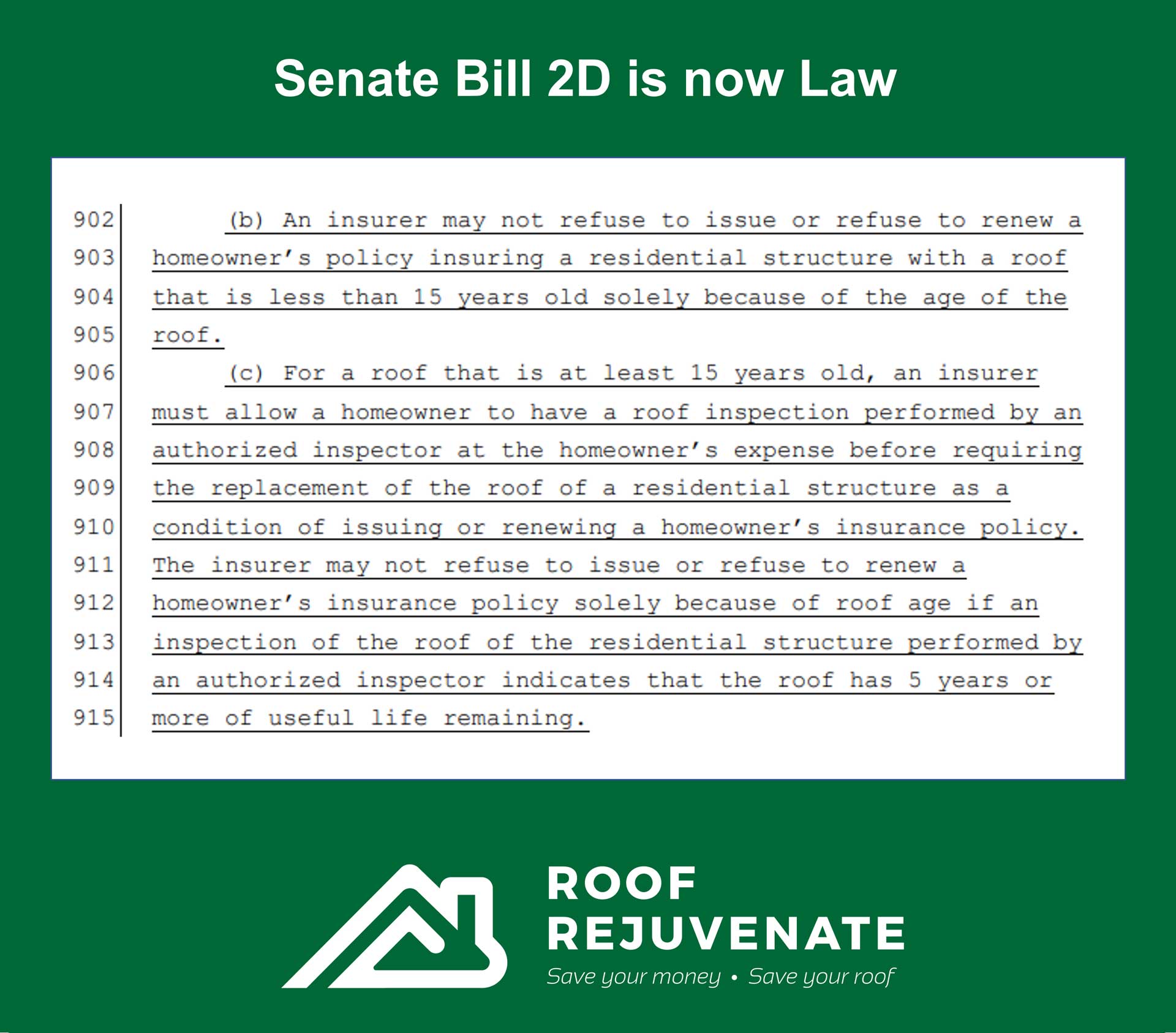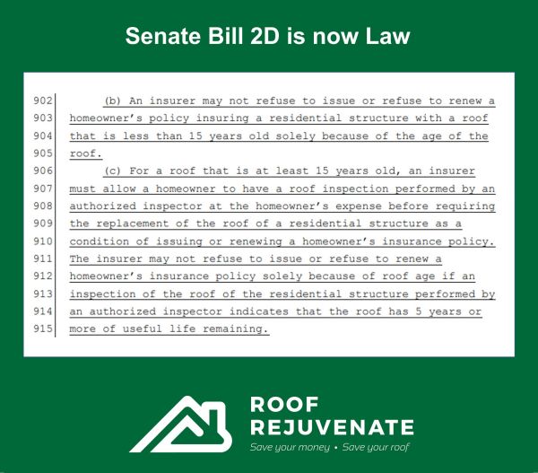If your roof is a candidate for rejuvenation, you will be provided with a roof certification from an independent, state-licensed roof inspector indicating at least 5 years or more of useful life remaining. With this certification, ALL carriers underwriting homeowner's insurance here in the State of Florida CANNOT deny coverage or force replacement as a condition of renewal. It's Florida law and we wouldn't treat your roof without being able to provide this certification along with our rejuvenation process. Below is a snapshot of the law... to read the law in it's entirety, click here... https://www.flsenate.gov/Session/Bill/2022D/2D/?Tab=BillText